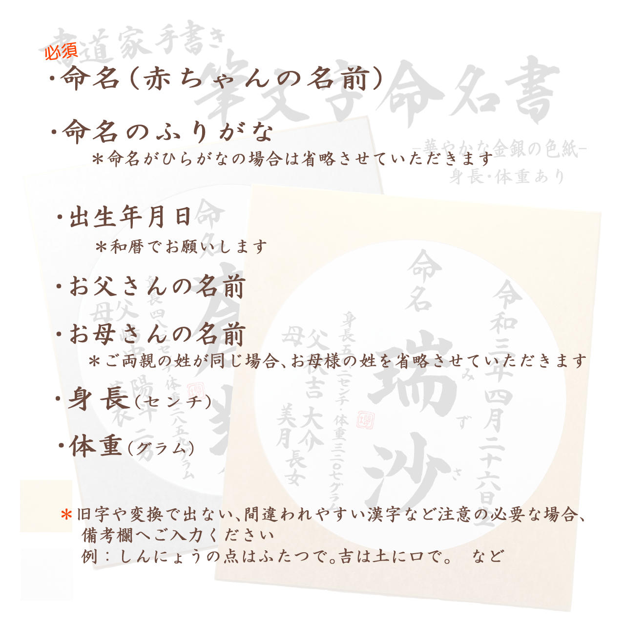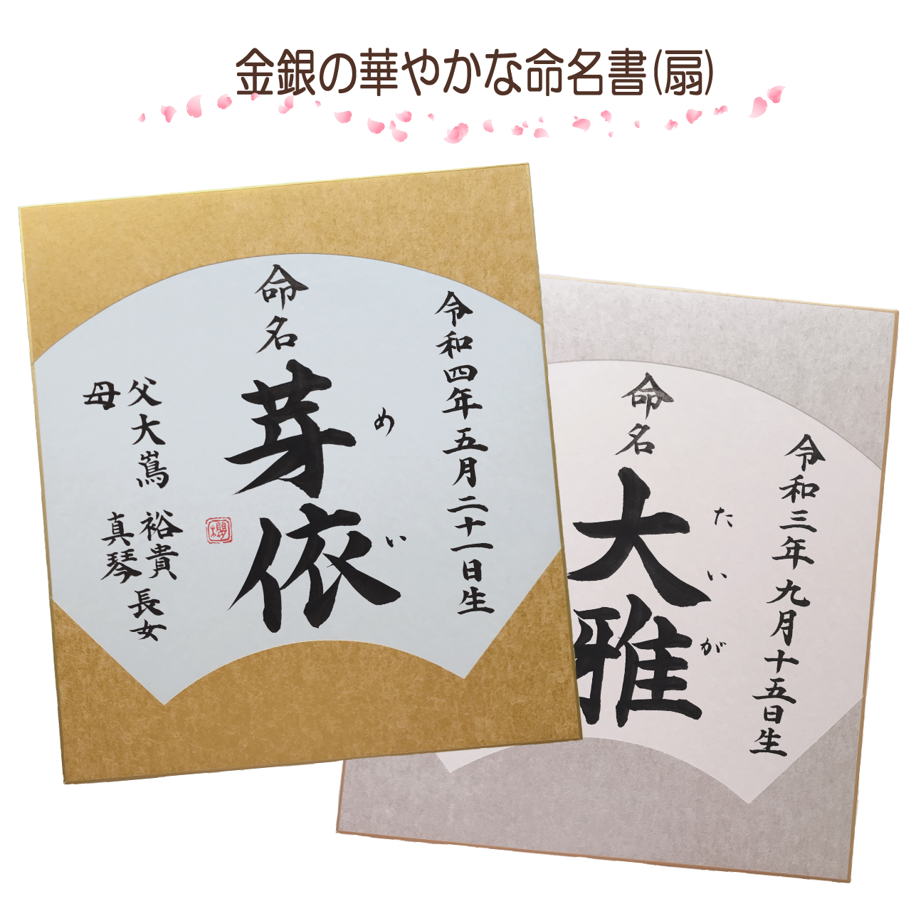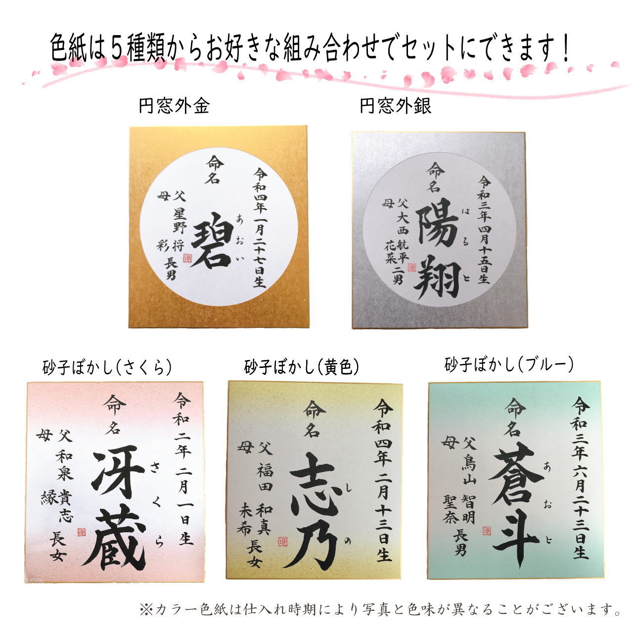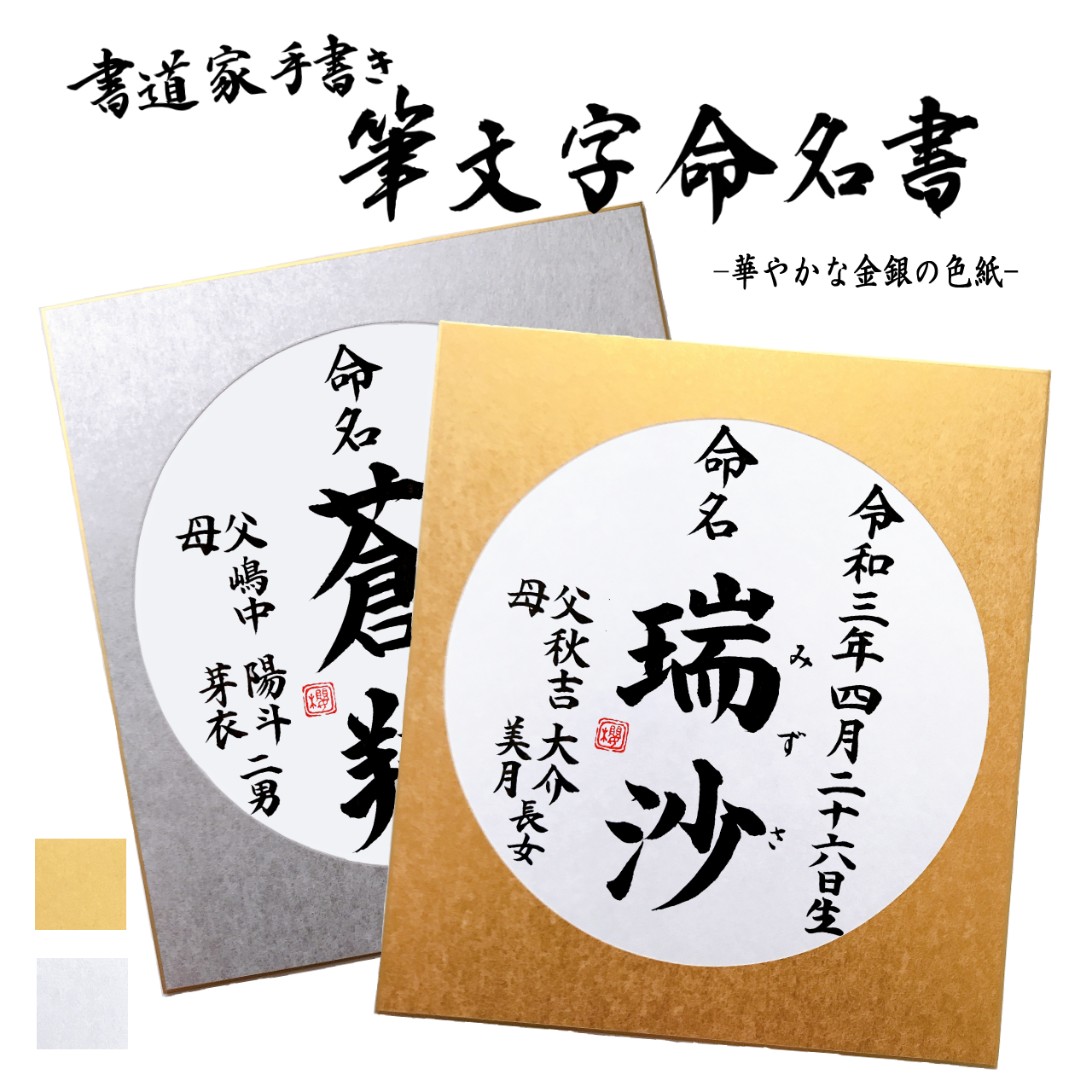 書道家手書き筆文字のシンプルな色紙命名書 金銀の華やかな色紙(円窓) 命名書代筆 ふでもじ 手書き オリジナル オーダーメイド命名書 2枚セット