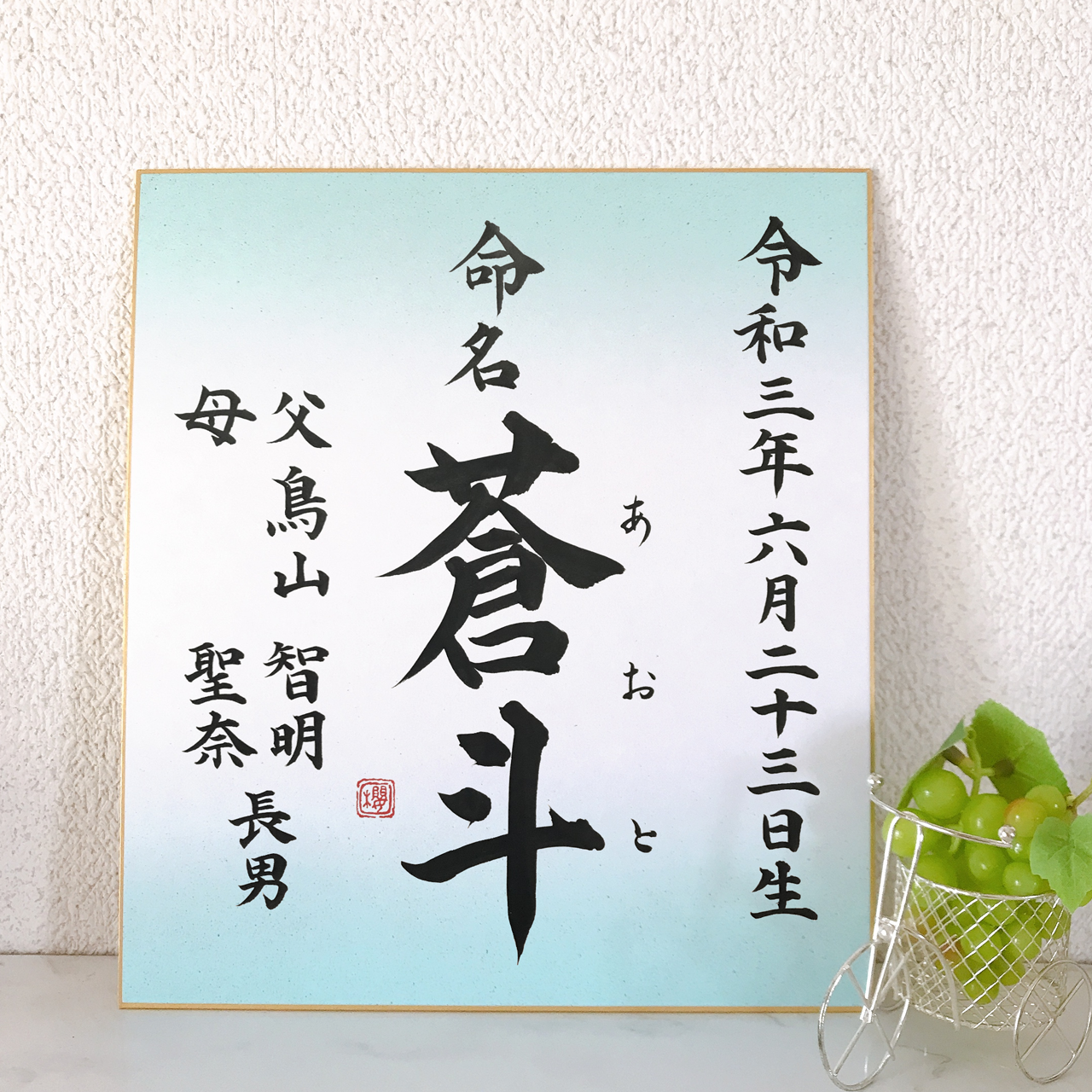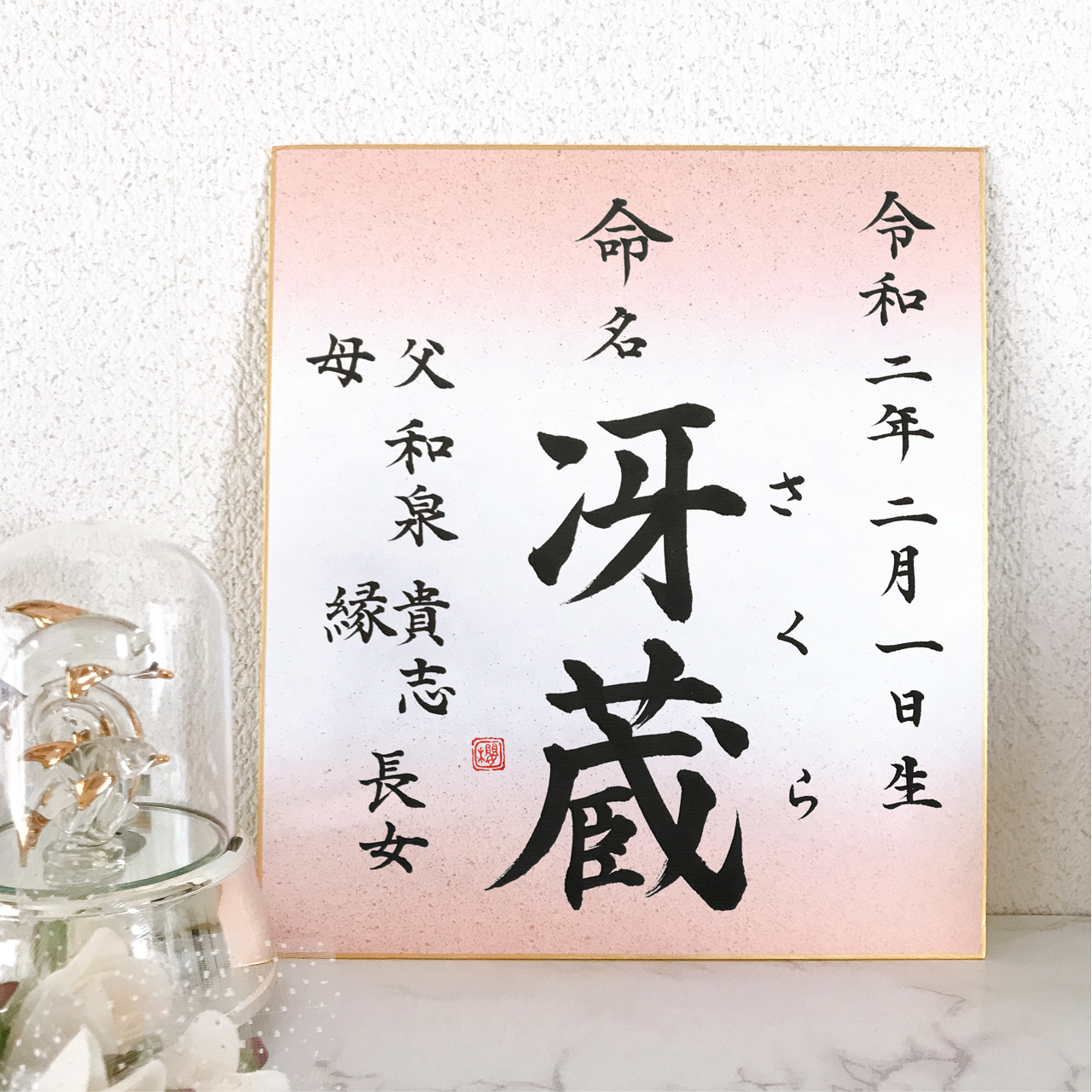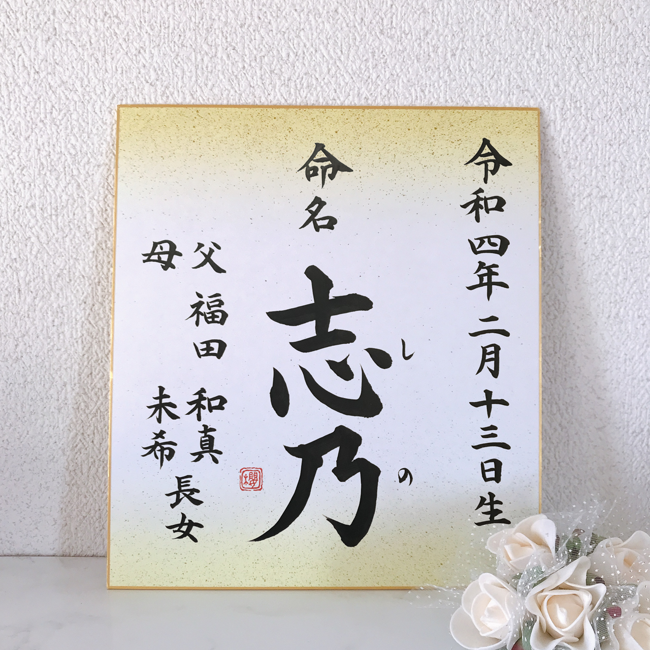 書道家手書き筆文字のシンプルな色紙命名書 金銀の華やかな色紙(円窓) 命名書代筆 ふでもじ 手書き オリジナル オーダーメイド命名書